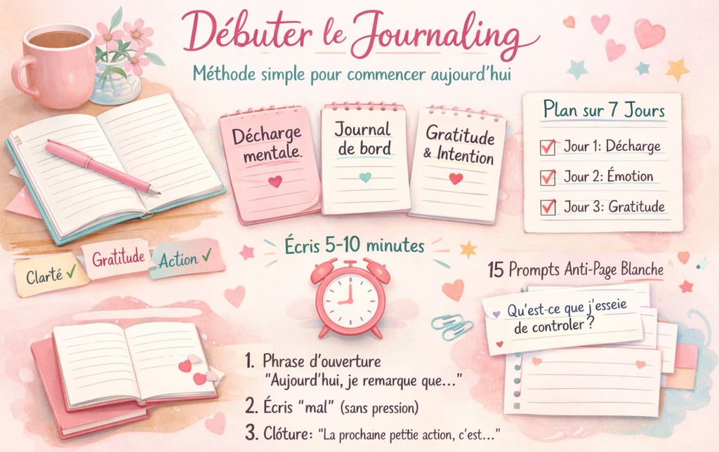 Bonne nouvelle : tu n’as pas besoin d’être “inspiré(e)”, d’avoir une vie incroyable, ni d’écrire des pages entières. Tu as juste besoin d’une méthode simple, répétable, et assez légère pour démarrer… aujourd’hui.